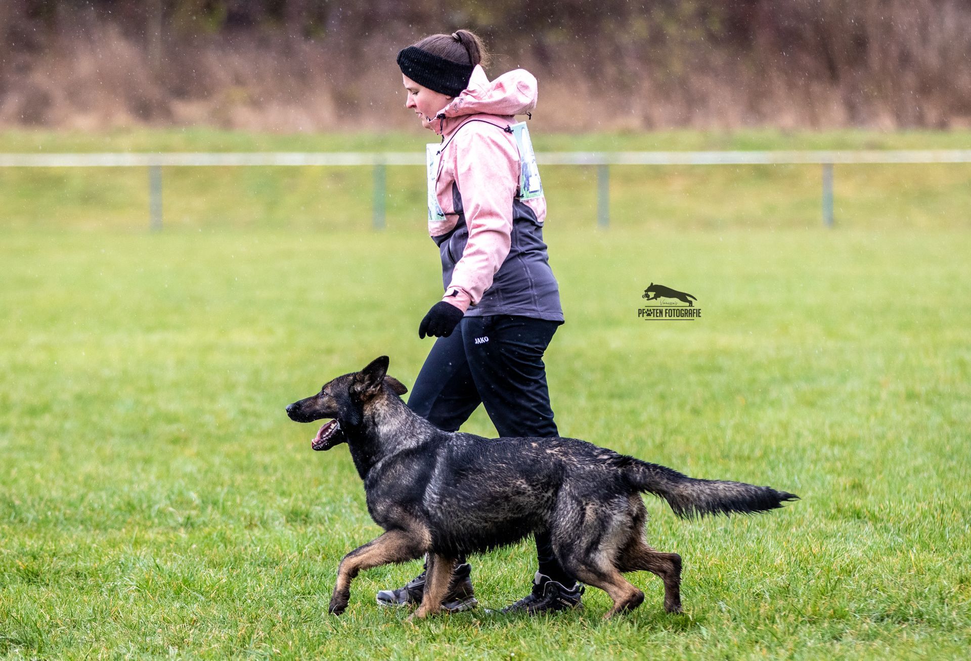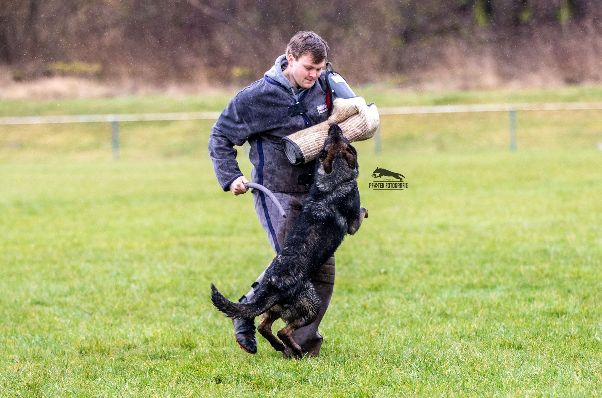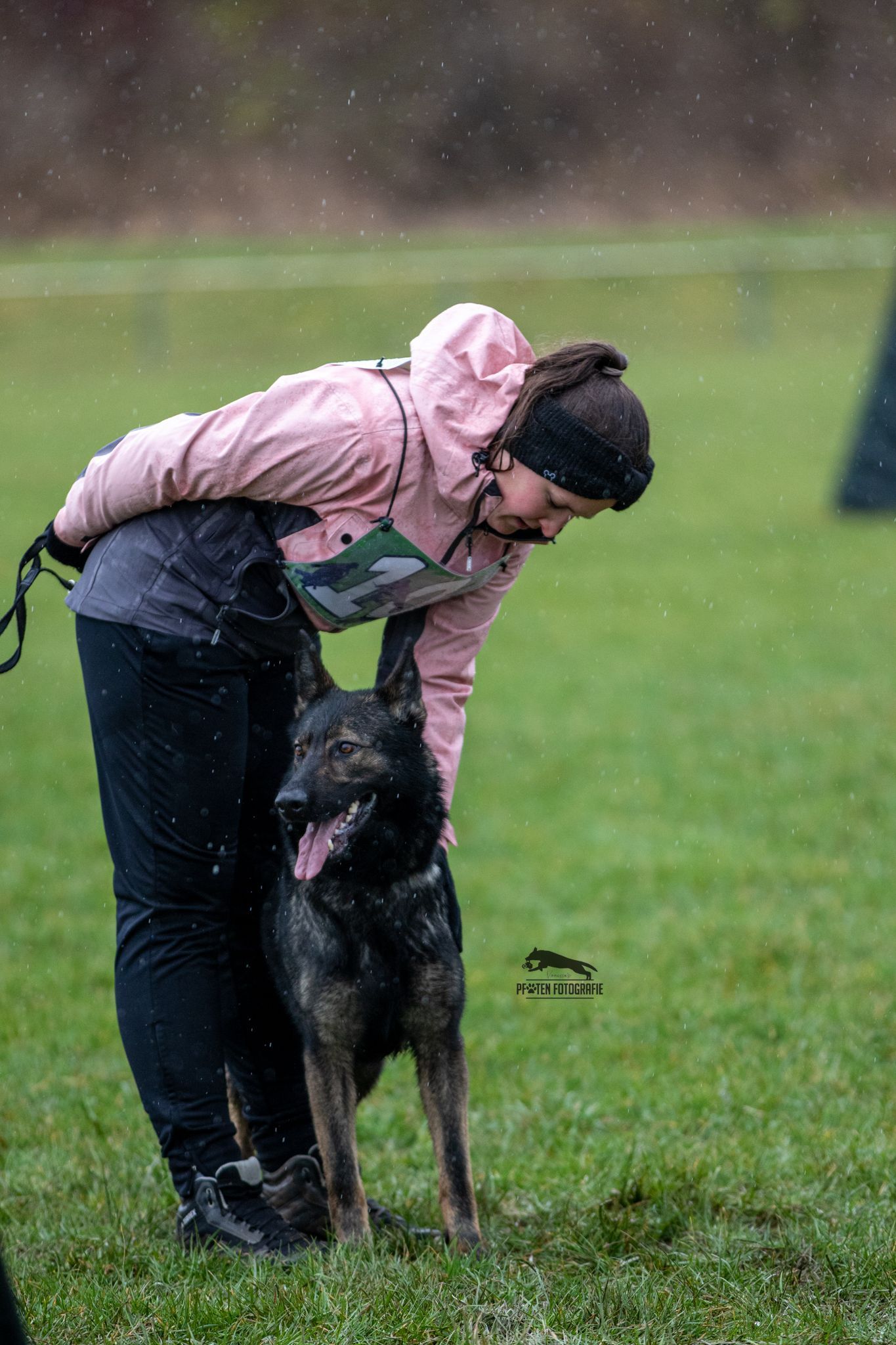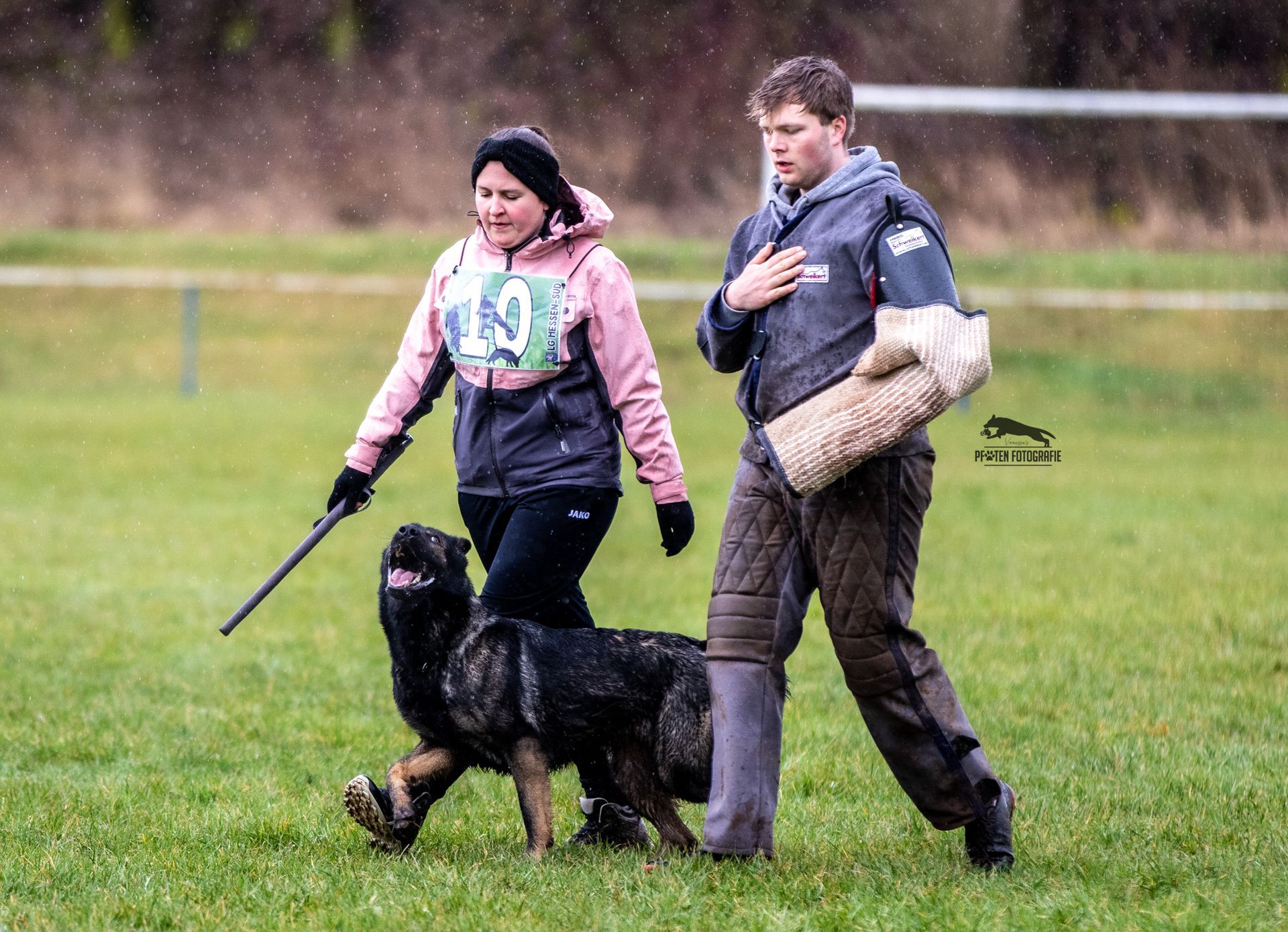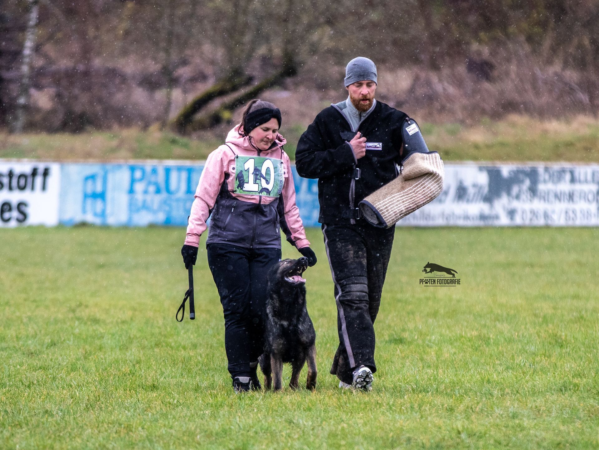 Als letztes Stand dann der Schutzdienst an. Mittlerweile sah man Louisa, aufgrund des Dauerregens schon im dritten Outfit des Tages. Die Wetterverhältnisse machten auch dem Publikum zu schaffen was sich gebündelt unter ein kleies Pavillon quetschte um nicht komplett nass zu werden. Im Schutzdienst konnten die beiden dann das Training abrufen und erhielten sehr gute 91 Punkte von Holger Pecho.